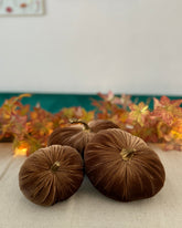 Three velvet pumpkins in brown, pink, and beige on a table with autumn leaves in the background.